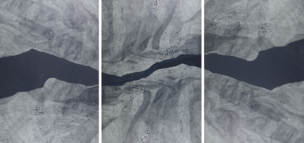Il lavoro di Ngbwa trae origine, dunque, dalla mescolanza di numerosi tempi e spazi che si concretizza nel processo di stampa attraverso la sovrapposizione di matrici diverse assemblate, ruotate e ribattute sullo stesso foglio di carta in un costante movimento di deterritorializzazione e riterritorializzazione. In tal senso le sue opere divengono geografie interiori, elementi precordiali, cartografie affettive in grado di coniugare i tempi anarchici, sconnessi e sovrapposti dell’esistenza nello spazio eterno della visione.