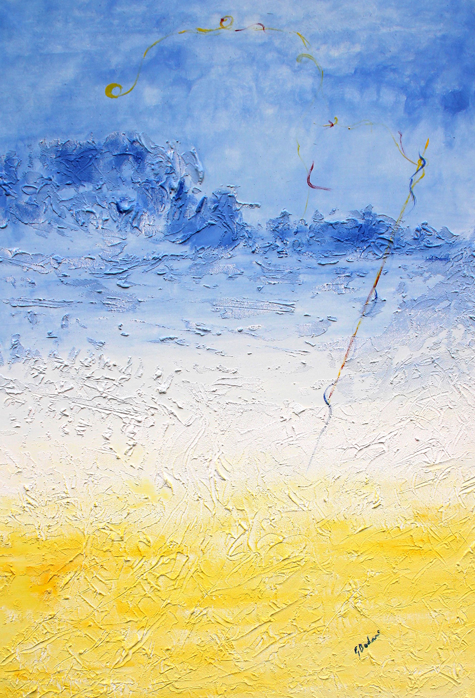 Nei lavori presentati in questa prestigiosa cornice mantovana, il disegno preparatorio si è ormai dissolto, lasciando il posto all’emozione nella sua purezza più autentica. La figura, simulacro confortevole della realtà, ha lasciato il posto ad una pennellata informale, memore subcosciente del migliore astrattismo europeo da Jean Fautrier a Wols a Nicolas De Staël. Se alcune opere – Alberi uccelli nuvole stelle, Bosco materico, Cielo e terra, ll fiume, Panorami rossastri e Riflessi sul grande fiume – sembrano mantenere ancora i contorni di un discorso paesaggistico seppure ormai irreale, in altre tele – Cieli azzuri, Gialli e rosa (Primavera), Rosa (Estate), Giallo (Autunno), Azzurri (Inverno), Ultima ansa, Bosco azzurro, Riflessi giovanili, Crepe, Voglia di giallo, Il mio argine e Deserto – il legame con la rappresentazione è ormai arbitrario, cionondimeno fortemente intenzionale.