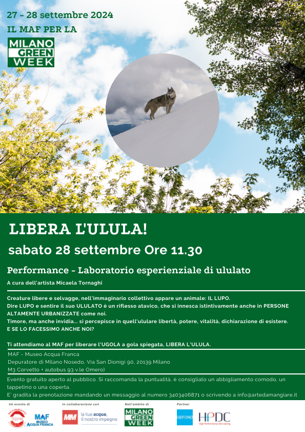 un’esperienza di yoga nel verde e nell’arte a cura dell’insegnante di yoga e artista Silvia Capiluppi che si terrà alle ore 10.00, si prosegue alle ore 11.30 con “Libera l’ULULA” performance e laboratorio esperienziale di ululato dell’artista Micaela Tornaghi aperto al pubblico, in chiusura “Rotolo di storie d’acqua” performance dell’artista Sara Casal.