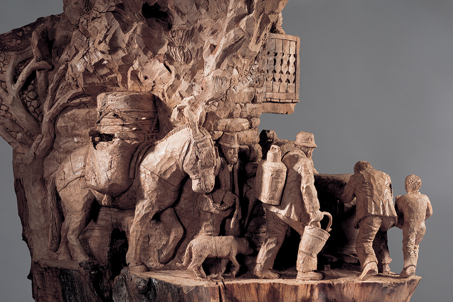 Gli anni dell’infanzia e della giovinezza trascorsi in famiglia, lavorando con il padre la terra o nella gestione dell’osteria, hanno affinato il suo sguardo ad osservare e fissare gesti tipici e caratterizzanti l’attività contadina, il rapporto con gli animali e le inclemenze atmosferiche, la neve e il gelo. I suoi occhi indagatori studiano l’uomo intento a fabbricare i cesti, il contadino che affila e batte la falce, l’apicoltore, il taglialegna, i battitori del grano, i montanari che costruiscono la carbonaia e tutto questo “savoir faire” diventa materia ed ispirazione per le sue grandi sculture.