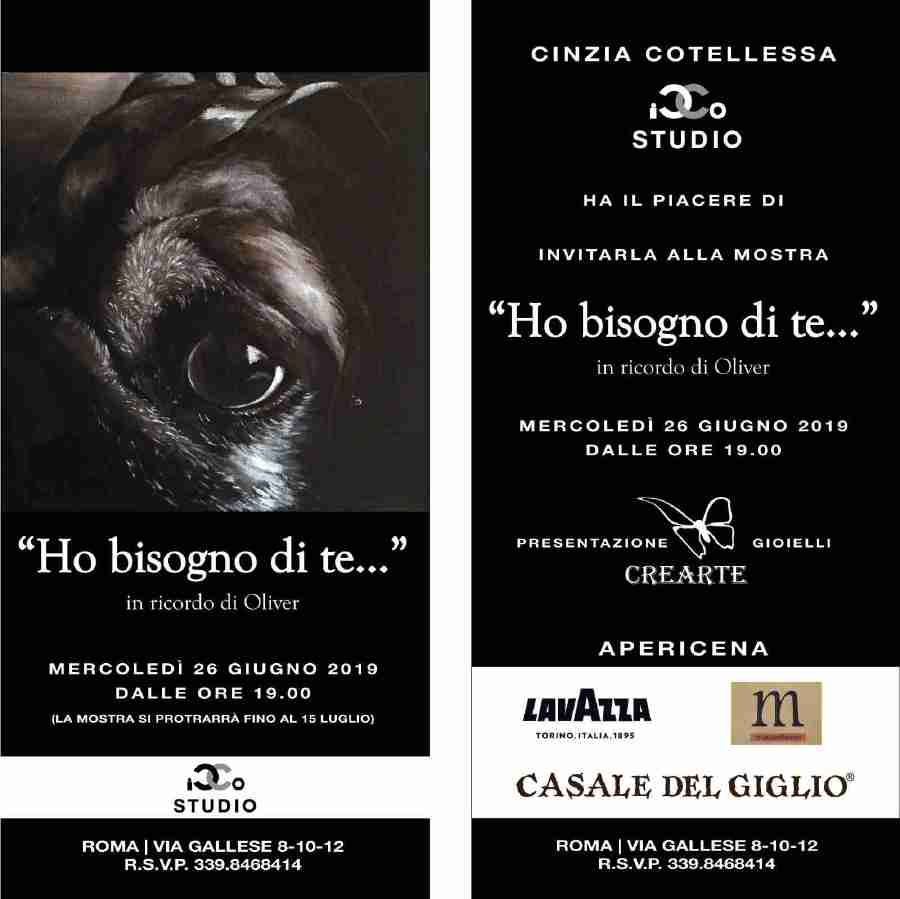 Questa collezione nasce dal desiderio dell'Artista, di rendere protagonisti i nostri amici a quattrozampee di dare un segno di riconoscenza a Loro che ci amano incondizionatamente fino all'ultimo istante...2010 il primo approdo di questa esposizine fu a Roma nella Torretta Valadier, il secondo agli Horti di Vejo e poi ancora alla Galleria Stefano Simmi ...Il logo della mostra e' ripreso da un piccolo olio dedicato ad Oliver il pet dell'artsta Cinzia Cotellessa, magistralmente realizzato in olio e l'opera è centrata sullo sguardo...Potrebbe essere qualsiasi animale ma il messaggio che arriva è nel titolo della mostra "HO BISOGNO DI TE" loro hanno bisogno di noi ma noi di loro...