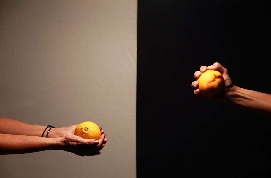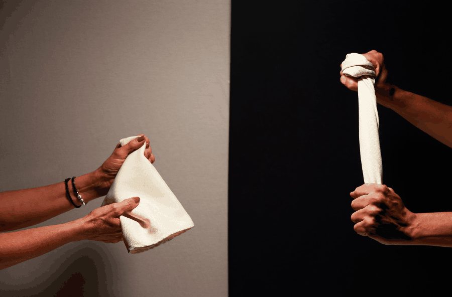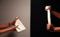 La casa, e la cucina in particolare, rappresentano il luogo per eccellenza dell’accoglienza, dell’amore e della familiarità, prototipo assoluto di sicurezza; esse, però, si trasformano allo stesso tempo nello spazio dove si annidano rancore e frustrazioni da cui hanno poi origine le più grandi forme di violenza. Sfondi bianchi si alternano a sfondi grigio scuri, e su di essi si confrontano parole, a tratti amorevoli, ad altri aggressive, e gli stessi utensili assumono valenze opposte: con un’impugnatura diversa, ognuno di essi può assolvere ad una duplice funzione, trasformandosi da oggetto di necessità e cura a fendente.