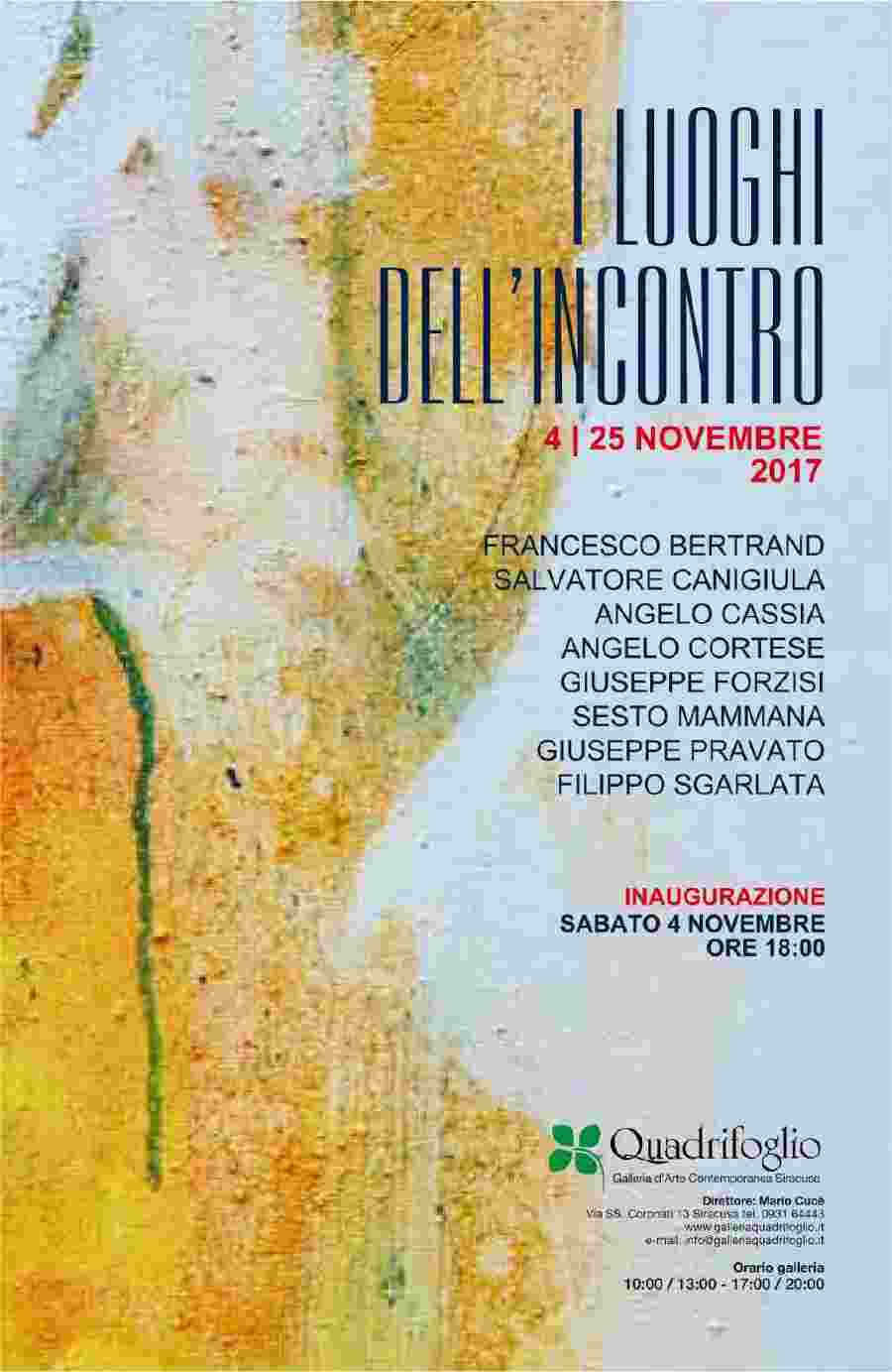 Siracusa - Sabato 4 novembre alle ore 18,00 negli spazi espositivi della Galleria Quadrifoglio di via dei Santi Coronati 13 (Ortigia) aprirà al pubblico la collettiva d’arte “I luoghi dell’incontro”, a cura di Mario Cucè. In mostra le opere di cinque pittori: Francesco Bertrand, Angelo Cassia, Angelo Cortese, Sesto Mammana, Filippo Sgarlata; e tre scultori: Salvatore Canigiula, Giuseppe Forzisi e Giuseppe Pravato.