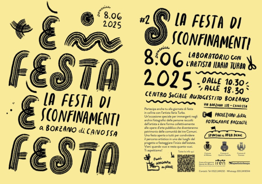 Domenica 8 giugno 2025, tra le ore 10.30 e le 18.30 presso il Centro Sociale Autogestito BORZANO di Canossa (Reggio Emilia) si svolgerà a ciclo continuo la FESTA DI SCONFINAMENTI, il primo evento pubblico ideato dall’artista Ilaria Turba per la seconda edizione di Sconfinamenti. Arte e natura nelle terre matildiche, curata da Daniele De Luigi.