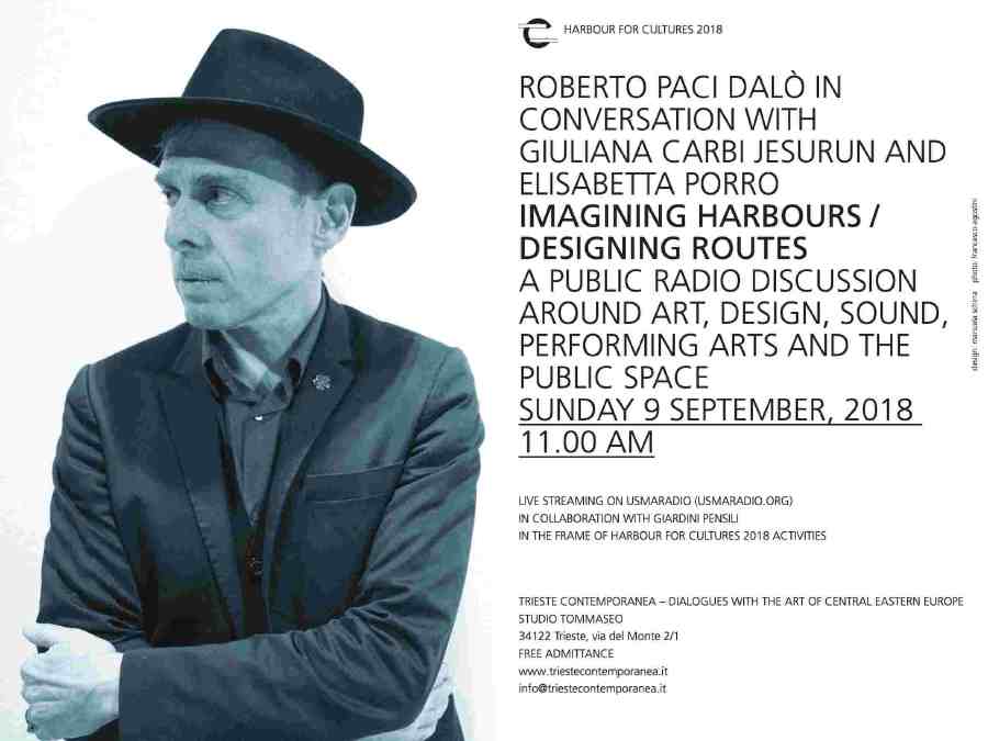 Domenica 9 settembre alle 11.00 presso lo Studio Tommaseo si svolgerà un evento speciale che avrà come protagonista l'artista e musicista Roberto Paci Dalò. "Imagining harbours / designing routes", questo il titolo della conversazione, fa parte delle attività del progetto "Harbour for Cultures" e vedrà insieme a Dalò Giuliana Carbi Jesurun e Elisabetta Porro. La conversazione verterà su arte, design, suono, arti performative e lo spazio pubblico e sarà proposta (in lingua inglese), in collaborazione con Giardini Pensili, in diretta radiofonica su Usmaradio, radio dell'Università degli Studi della Repubblica di San Marino.