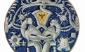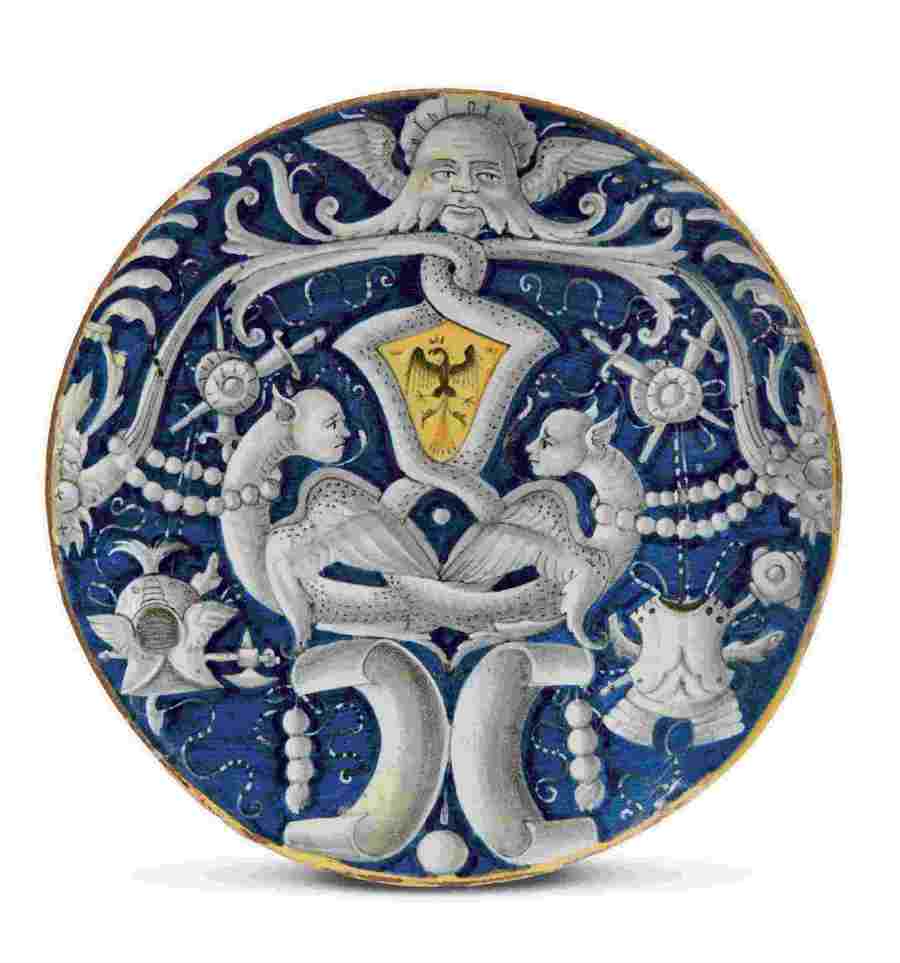 Lasciando il capitolo dei vasi apotecari, tra le molte altre opere d’interesse presenti in catalogo, segnaliamo un piatto realizzato a Casteldurante databile tra il 1520 e il 1530, per il quale sono richiesti 70.000/100.000 euro, che fa mostra di uno dei decori che Cipriano Piccolpasso mirabilmente descrive nella sua celeberrima opera sull’Arte del Vasaio: candelabra con scudi elmi e loriche collegati tramite nastri svolazzanti, realizzato a risparmio poi ombreggiato con mezzatinta grigia su fondo steso a pennellate parallele blu cobalto.