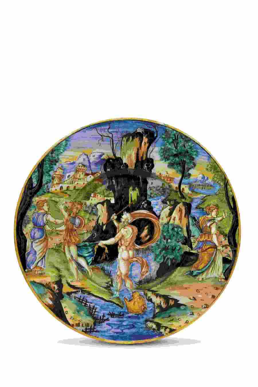 Ancora, un raro piatto da parata realizzato a Deruta nell’ultimo quarto del XV secolo che presenta, nel cavetto, con la raffigurazione del mito di Diana e Atteone realizzato in maiolica policroma nei modi caratteristici dei primissimi ornati rinascimentali, valutato 40.000/60.000 euro. Da questo questo medesimo ambito proviene una piccola coppa con un decoro molto significativo a cornici concentriche che racchiudono un braccio con armatura che sorregge una B particolarmente apprezzato da studiosi e collezionisti, attribuita a Deruta e valutata 2.000/3.000 euro.