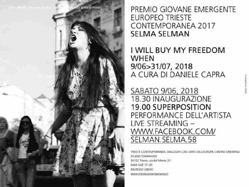 Sabato 9 giugno alle 18.30 presso lo Studio Tommaseo sarà inaugurata la personale I will buy my freedom when di Selma Selman, vincitrice del Premio Giovane Emergente Europeo Trieste Contemporanea 2017. Seguirà alle 19.00 la performance dell’artista Superposition, che sarà visibile anche in diretta streaming su Facebook. La mostra, curata da Daniele Capra, raccoglie una decina di opere recenti che spaziano da video a lavori su carta, fino ad opere di natura concettuale appositamente realizzate per lo spazio triestino.