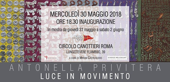 Antonella Privitera artista romana con origini siciliane, da sempre connota il proprio stile come lo specchio della sua stessa esistenza e riflettendo sulle esperienze importanti che ne hanno arricchito l’animo, grazie anche a lunghi viaggi stagionali che l’hanno guidata in giro per il mondo alla riscoperta di nuove culture e diverse tradizioni. Con questo approccio alla quotidianità sempre in divenire, l’artista ha potuto rivelare il proprio percorso con continuità rispetto alla medesima poetica: Antonella considera soprattutto la sua arte un mezzo per arrivare alla gente comune, per tendere loro una mano. Un invito a riflettere su valori sottili come del rispetto, ponendo una particolare attenzione a temi dell’attualità. Dopo l’ultima mostra inaugurata a ottobre scorso in ambito della 13° esima Giornata del Contemporaneo del progetto Amaci, anche questa nuova esposizione presso il Circolo canottieri Roma dal titolo “Luce in Movimento” e come anche le precedenti, si inserisce perfettamente nel Travelling Arts Project, sposandone al meglio gli obiettivi. Il Progetto di Arte Itinerante Contemporanea nato nel 2013 da un’idea della curatrice e critica d’arte Miriam Castelnuovo con la prima esposizione collettiva presso il Bioparco, si pone come obiettivo quello di far conoscere l’arte ad un pubblico eterogeneo e di appassionare lo spettatore educandolo alla conoscenza della diversità intesa come arricchimento culturale, anche in luoghi non istituzionali come musei o gallerie d’arte. Per questa nuova mostra “Luce in movimento” allestita sapientemente da Sauro Radicchi all’interno dei saloni messi a disposizione da uno dei più bei circoli sportivi della capitale, Antonella Privitera si è ispirata sapientemente al tema della luce, ove con la parola illuminazione ci si collega non solo a questo particolare momento creativo guidato da nuova ispirazione personale, ma la Luce in Movimento è da intendere anche come l’inizio di una rinascita culturale contemporanea, a cui in molti auspichiamo. In mostra verranno allestite opere nuove realizzate da Antonella in cui la luce ha un ruolo di protagonista in tutte le sue declinazioni, oltre che a mantenere sempre salda la propria attenzione verso la sfera sociale - tema trattato in modo approfondito nel testo del catalogo di Antonella Privitera a cura di Miriam Castelnuovo e il cui progetto grafico è stato egregiamente realizzato dall’art director Roberta Micchi.