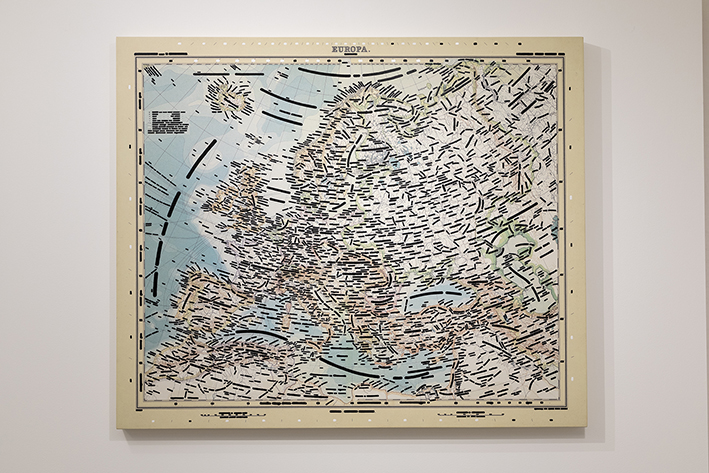 Isgrò partecipa a “L’Europa non cade dal cielo” con due opere: “Minicancellatura”, il lavoro 10x12cm realizzato per la raccolta Italia di Imago Mundi Collection, ed “Europa Q99”, che rappresenta un’Europa di inizio Novecento la cui toponomastica è stata oscurata in quel superamento di confini e divisioni che risuona negli ideali di Altiero Spinelli evocati nello stesso titolo della mostra. “Quando si cancellano i nomi delle montagne o dei fiumi, si riporta il mondo a uno stato di natura prelinguistica, quando non esistevano né l’uomo né la parola. A uno stato virtuale di libertà e di pace, quando l’uomo non era ancora apparso sul pianeta con i suoi egoismi generatori di guerre, divisioni e conflitti”, afferma Isgrò in un’intervista a proposito delle sue mappe.