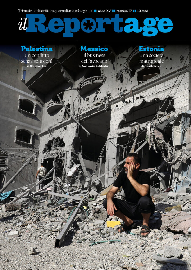 Sulla copertina del numero 57, il primo numero del 2024, quindicesimo anno di Reportage, c’è la foto di un uomo seduto sulle macerie provocate dai continui bombardamenti israeliani nella Striscia di Gaza, governata da Hamas. L’uomo è di Rafah, la foto di Anas Mohammed è dell’ottobre scorso, ma gli attacchi israeliani contro i palestinesi continuano ancora oggi e fanno migliaia e migliaia di morti, uomini, donne e bambini. Al conflitto in Palestina, che non sembra poter più avere soluzione, al folle genocidio da parte del governo Netanyahu, sono dedicati l’editoriale di Riccardo De Gennaro e un reportage di Christian Elia dalla Cisgiordania.