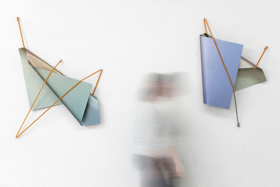 Le corde arancioni, in tensione, reggono, sorreggono e intersecano lastre di alluminio, anch'esse (come la pellicola plastica di “Versions”) prima stampate digitalmente e successivamente piegate dalle mani dell’artista.