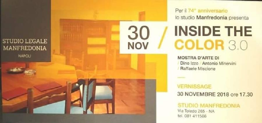 Un’indagine sul colore e le sue molteplici possibilità espressive. Venerdì 30 novembre, ore 17.30, lo Studio Manfredonia, in occasione del 74° anniversario dalla sua fondazione, apre i propri spazi al pubblico con l’evento espositivo Inside the colours 3.0, una mostra collettiva che vede come protagonisti Dino Izzo, Antonio Minervini e Raffaele Miscione. L’evento, visitabile fino al 9 gennaio 2019, esplora le potenzialità del colore attraverso punti di vista differenziati: dall’astrattismo geometrico di Minervini, alle composizioni informali di Miscione fino ai grafismi cromatici di Izzo. L’idea di festeggiare la ricorrenza con l’organizzazione di un evento espositivo nasce da una comune sensibilità dei suoi associati, avvocati e commercialisti, che si esplicita in un collezionismo perseguito da anni. La mostra è anche un modo per dare la possibilità a cittadini e turisti, in occasione delle ricorrenze natalizie, di fare un percorso alternativo di conoscenza dei talenti partenopei, in un luogo situato nel cuore del centro storico della città.