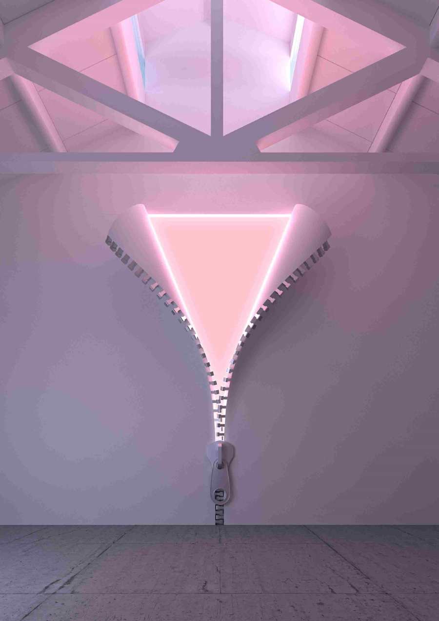 All’esterno, infatti, l’artista ricrea una facciata totalmente nuova il cui prospetto – che richiama l’estetica della tradizionale architettura milanese – sembra “aprirsi” in una delle sue estremità attraverso una zip che lascia intravedere l’interno dell’edificio; gli spazi interni, invece, sono radicalmente trasformati attraverso “aperture” inaspettate nel pavimento in cemento e nelle pareti in pietra. Il simbolo della zip si rivela così il tratto distintivo del progetto, l’espediente attraverso cui l’artista dà origine a una serie di fenditure surreali da cui si propaga una luce eterea e impalpabile che inonda lo spazio, trasportando il visitatore in un’esperienza inedita e immersiva.