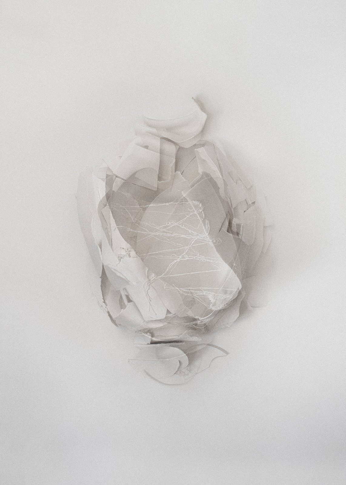 Le linee di faglia, che segnano non solo la materia ma anche l'anima degli oggetti, nelle mani dell'artista si trasformano in tracce preziose: le porcellane - nelle forme originarie di vasi e piatti - sono intenzionalmente frantumate per poter essere ricomposte grazie all'uso del filo di lino, che sostituisce qui l'oro della tradizione giapponese del kintsugi. Filo e ricucitura rappresentano una vera e propria dichiarazione estetica, creando un nuovo vocabolario visivo, dove ogni giunzione diventa un momento di bellezza e occasione di contemplazione sul carattere transitorio di ogni esistenza.
