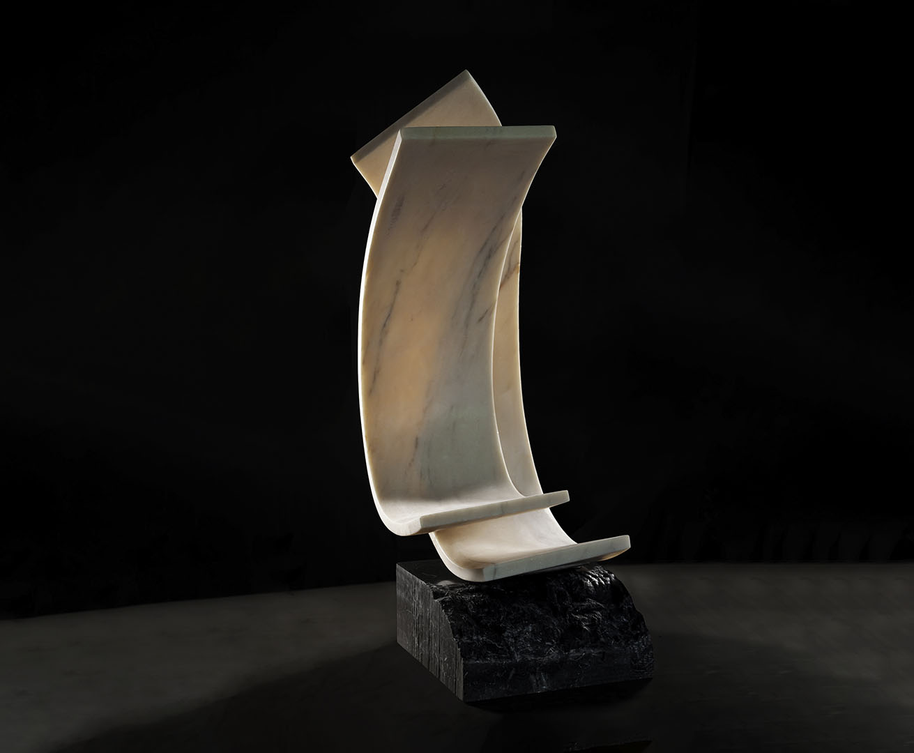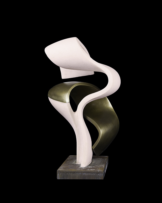 Le opere in mostra testimoniano un percorso armonico, nel quale la pesantezza fisica della materia utilizzata, a partire dalle prime opere in ferro a quelle in bronzo fino a quelle realizzate in marmi pregiati, è emblematico di una consapevolezza del fare artistico che si fa via via più complesso, più impegnativo e anche più prezioso. L’opera “Interpretazione spaziale” del 2004, in ferro e travertino, costituisce un interessante quanto notevole punto di riferimento per tutta la produzione successiva. La sottile lamina in ferro si apre verso l’alto in spirali e si radica sulla colonna di travertino, non solo base di appoggio, ma parte integrante della scultura.