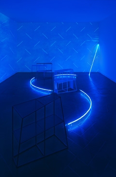 La semplificazione estrema delle forme e la loro riduzione a segmenti grafici che agiscono ora sulla superficie ora nello spazio gli hanno consentito di realizzare nel tempo opere e installazioni d’arte che tracciano rigorosi percorsi o controllate presenze che vivono della essenzialità dei materiali o che con l’inserimento di neon blu sviluppano - sfruttando un colore che è insito nel DNA dell’artista - atmosfere di particolare suggestione.