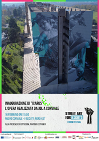 Porta la firma di JDL (Judith de Leeuw) – la nota street artist olandese apprezzata in tutto il mondo - il nuovo imponente murale di 40 metri dal titolo “Icarus” realizzato nell’ambito di Street Art for Rights Forum Festival sulla parete Nord-Est del palazzone di Corviale a Roma, il famoso "Serpentone", uno dei muri “più simbolici” della Capitale.