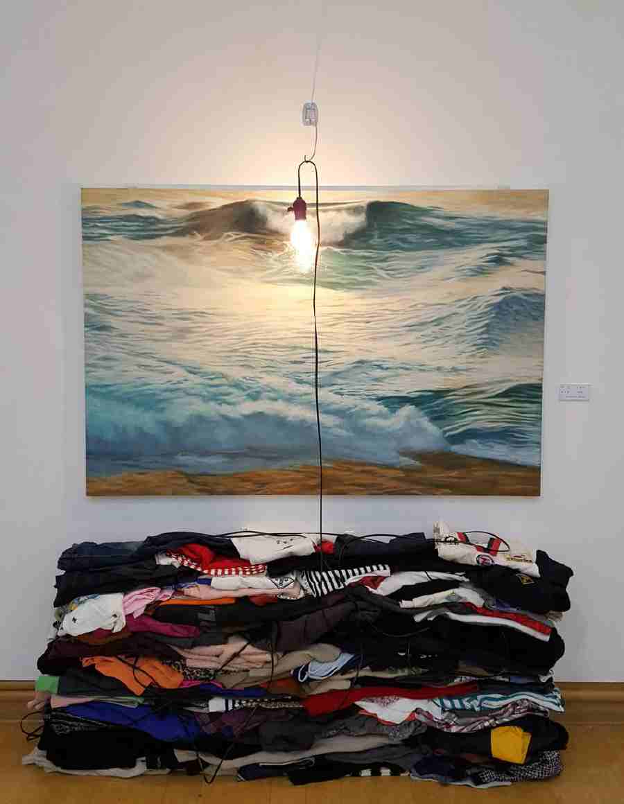 In Mental Image si rielabora la tragedia del naufragio del Sewol avvenuto il 16 aprile 2014 nelle acque della Corea del Sud, con solo 172 sopravvissuti su 476 persone, uno dei peggiori disastri avvenuti nel paese in tempo di pace. L’installazione si concentra sia sul concetto di perdita di vite umane che sul loro salvataggio: sul fondo un dipinto con il consueto soggetto di onde oceaniche d’infinito smarrimento e accoglienza nell’elemento; più vicino a noi la sua illuminazione chiarifica l’evento concreto del salvataggio avvenuto, con un cumulo di abiti piegati e impacchettati come un cerimoniale commemorativo dei dispersi, o un ex voto per i vivi.