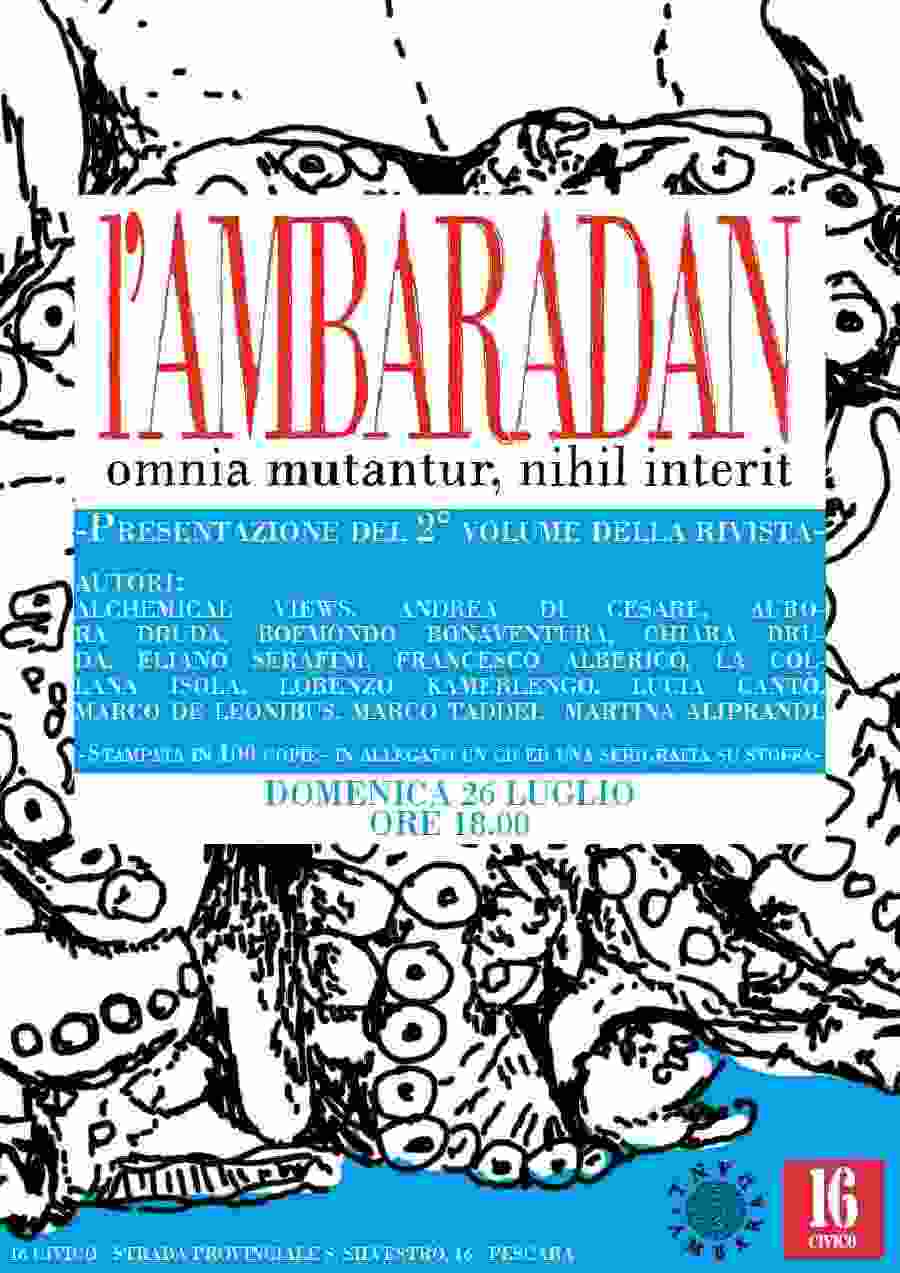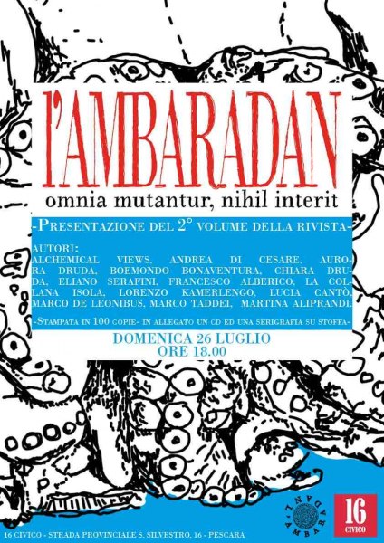 Domenica 26 luglio, presso lo spazio espositivo 16 civico, dove è attualmente in corso la mostra “Terzo paesaggio- Territorio di diversità”, avrà luogo la presentazione del secondo volume de “l’Ambaradan”. La rivista, stampata in cento copie numerate, assume con questo secondo numero un corpo cartaceo. Nel laboratorio di stampa dell’Associazione MiRicreo sono state realizzate le serigrafie, presenti in copertina e sull’allegato di tessuto con il progetto “La società mediocrea” di Andrea Di Cesare. Al centro del giornale, inoltre, è presente l’inserto serigrafato con il “Lemma n. 1” dal “Lemmario dell’Abruzzo immaginario” di Marco Taddei e Chiara Druda. Parallelamente al giornale, l’Ambaradan ha avviato anche una produzione discografica con un inedito Ep di Alchemical Views. Il progetto ha come obiettivo la costruzione di un museo di carta, uno spazio di sperimentazione visiva e linguistica privo di confini editoriali, in cui gli immaginari e le progettualità visionarie di diversi autori collaborano alla costruzione di universi astratti e potenzialità ipotetiche. L’Ambaradan è un luogo editorialeimmaginifico, un luogo astratto incarnato nella carta, in cui le parole e i segni rincorrono sinergie possibili.
