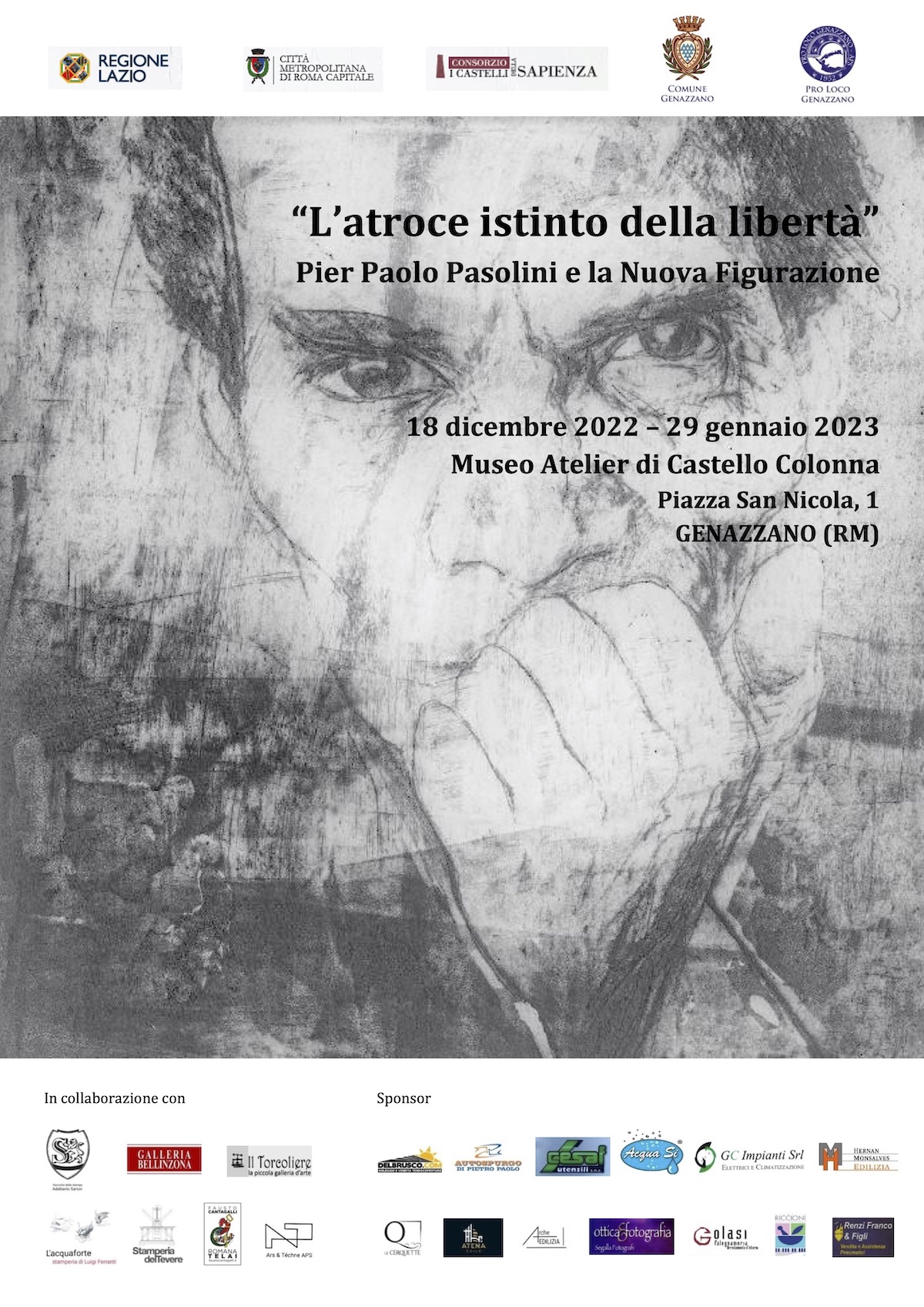 Domenica 18 dicembre 2022, presso il Museo Atelier di Castello Colonna a Genazzano, si inaugura la mostra “L’atroce istinto della libertà, Pier Paolo Pasolini e la Nuova Figurazione” a cura di Francesca Tuscano, con la collaborazione dell’Archivio Ennio Calabria, la Raccolta delle stampe Adalberto Sartori di Mantova, la Galleria Bellinzona di Milano e le stamperie d’arte L’acquaforte e la Stamperia del Tevere.