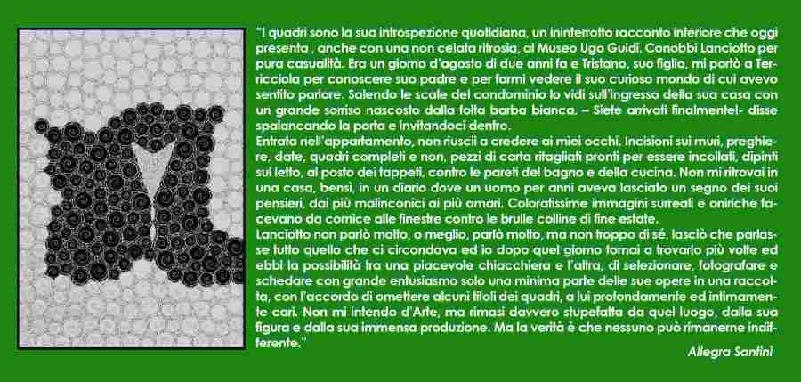 Lanciotto Baldanzi è nato a Terricciola (Pisa) nel 1949, inizia a dipingere fino dagli anni ’60. Nelle opere trasmette la volontà di frantumare la realtà caotica del mondo proponendo il suo universo. Dopo numerose esposizioni in Italia espone per l’ultima volta nel 1986 in Germania. Da allora non ha più esposto le opere che ha continuato a creare come dipinti e collage nella casa-atelier. Nel 1990 la sua turbolente anima agitata da un travaglio interiore lo spinse a dar fuoco ad oltre la metà delle sue opere.