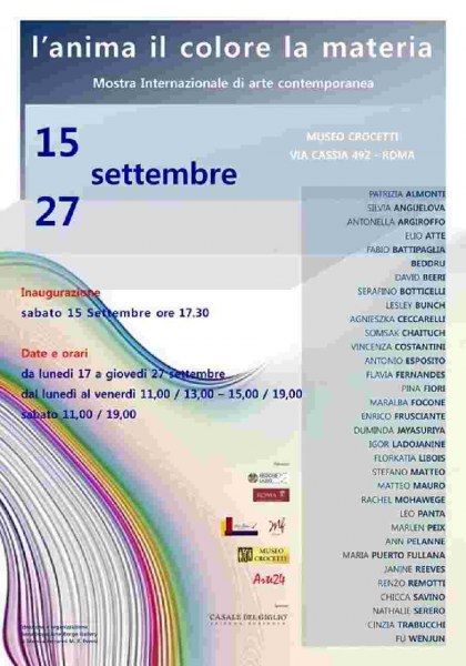 Verrà inaugurata sabato 15 settembre alle ore 17,30 la mostra collettiva di arte contemporanea “L’anima, il colore, la materia” presso la Fondazione Museo Crocetti- Via Cassia 492 - Roma. L’evento è curato dalla gallerista Anna Isopo di Arte Borgo Gallery e dal critico d’arte Monica Ferrarini di M.F.eventi e gode del patrocinio di: Regione Lazio e Municipio Roma I Centro.