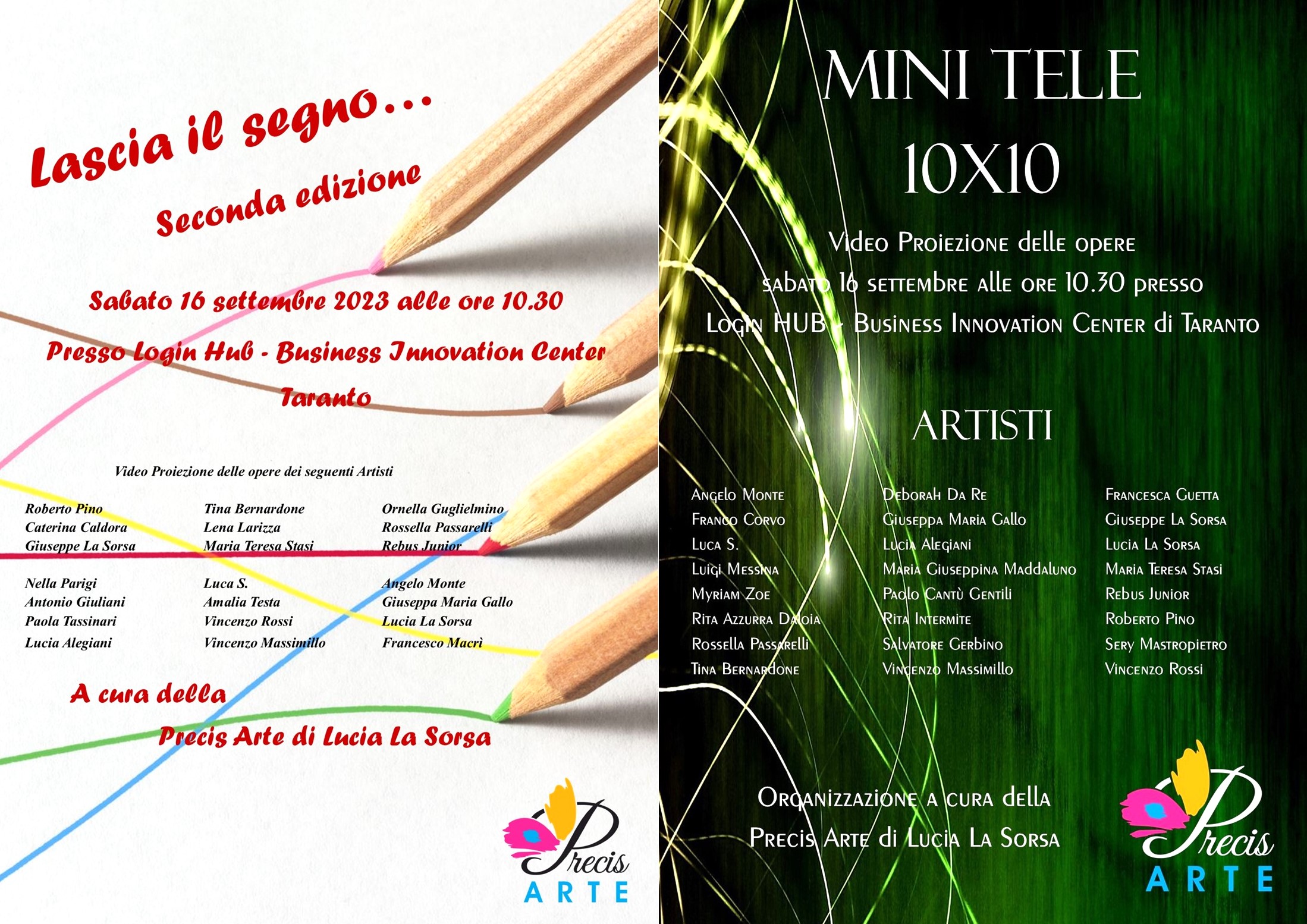 Sabato 16 settembre 2023 alle ore 10.30 ci sarà l’inaugurazione di due progetti d’Arte a cura della Precis Arte di Lucia La Sorsa, la seconda edizione di “Lascia il Segno” e la prima edizione di MINI TELE 10x10 presso la sala convegni del Login Hub – Business Innovation Center a Taranto in Viale Virgilio n.20/D.