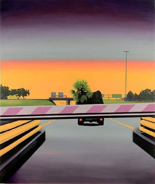 La sintesi grafica che caratterizza lo stile dell’artista milanese non stempera la sensazione di straniamento che lo spettatore prova davanti alle tele, anzi, la amplifica. Ciò che è familiare si rivela all’improvviso estraneo e quindi inquietante: in INT01 una mano che si intravede nell’angolo dell’immagine, casualmente appoggiata a un corrimano, genera suspense e inquietudine come in un thriller hitchcockiano, in cui il pericolo non appare manifesto. Queste “cartoline” di vita quotidiana diventano visioni oniriche in cui tutto può succedere o tutto è già accaduto e sfuggito ai nostri sensi.