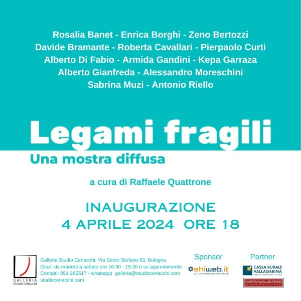Giovedì 4 aprile alle ore 18 inaugura a Bologna presso gli spazi di Galleria Studio Cenacchi in Via Santo Stefano 63 la mostra Legami fragili a cura di Raffaele Quattrone che ha coinvolto Rosalia Banet, Enrica Borghi, Zeno Bertozzi, Davide Bramante, Roberta Cavallari, Pierpaolo Curti, Alberto Di Fabio, Armida Gandini, Kepa Garraza, Alberto Gianfreda, Alessandro Moreschini, Sabrina Muzi, Antonio Riello.