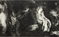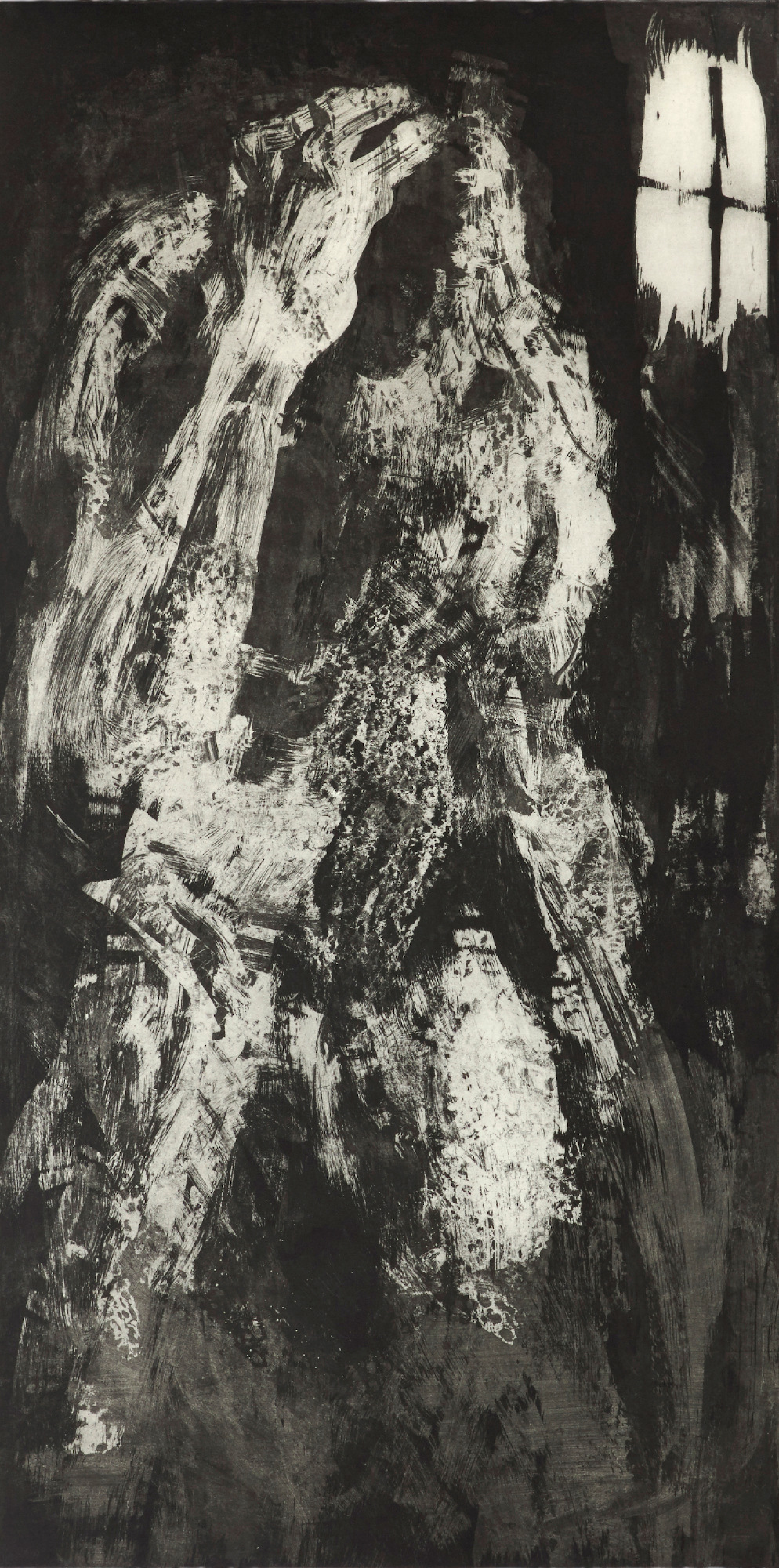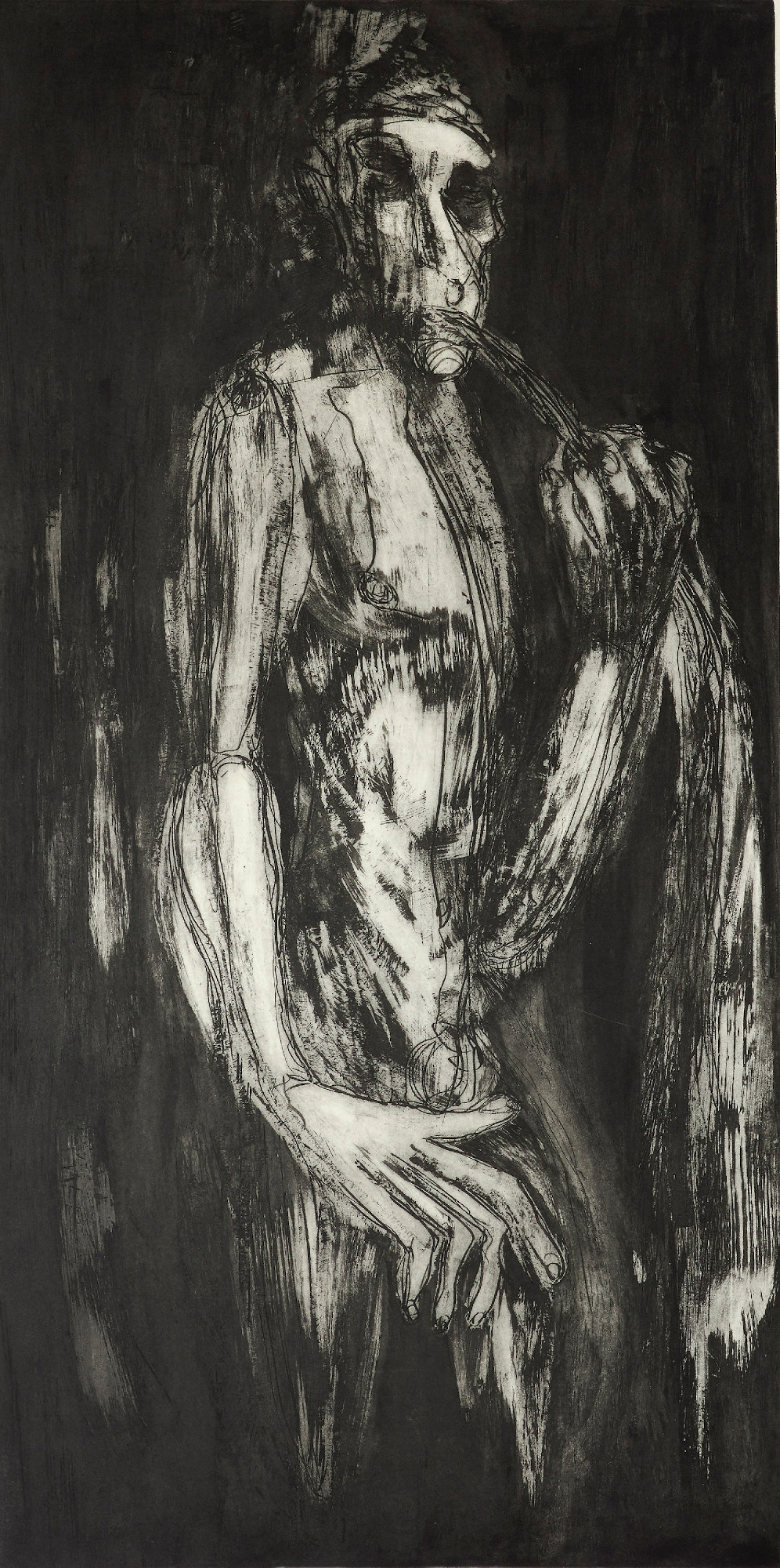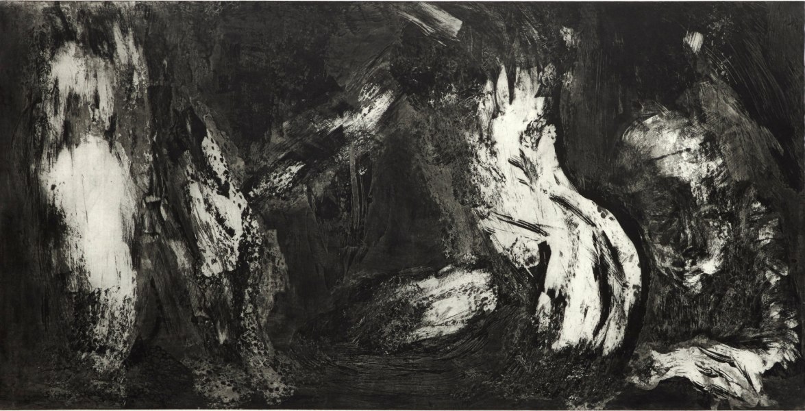 Le incisioni in mostra sono abitate da un buio inteso come fonte, in cui appaiono corpi trasfigurati dai processi della materia e dello spirito. Qui il corpo fisico si mostra per quello che è, un contenitore, fatto di una materia indefinita ma pulsante e viva: emergono dall’oscurità figure antropomorfe, simbolo di una umanità sofferta che si disfa sotto la pressione di un violento rivolgimento interno. Un viaggio di ricerca del proprio sé che approda a quell’Eterno Ritorno , da cui l’artista ripartirà per una nuova avventura ai confini del corpo-mondo.