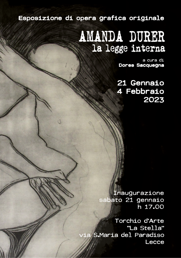 Si inaugura sabato 21 gennaio alle ore 17:00, la mostra personale di grafica e stampa d’arte dal titolo “La legge interna”, dell’artista pugliese Amanda Durer, presso lo spazio espositivo del Torchio d’Arte La Stella a Lecce, aperto al pubblico sino al 04 febbraio 2023. Durante l’inaugurazione sarà presente l’assessora alla Cultura del Comune di Lecce, Fabiana Cicirillo.