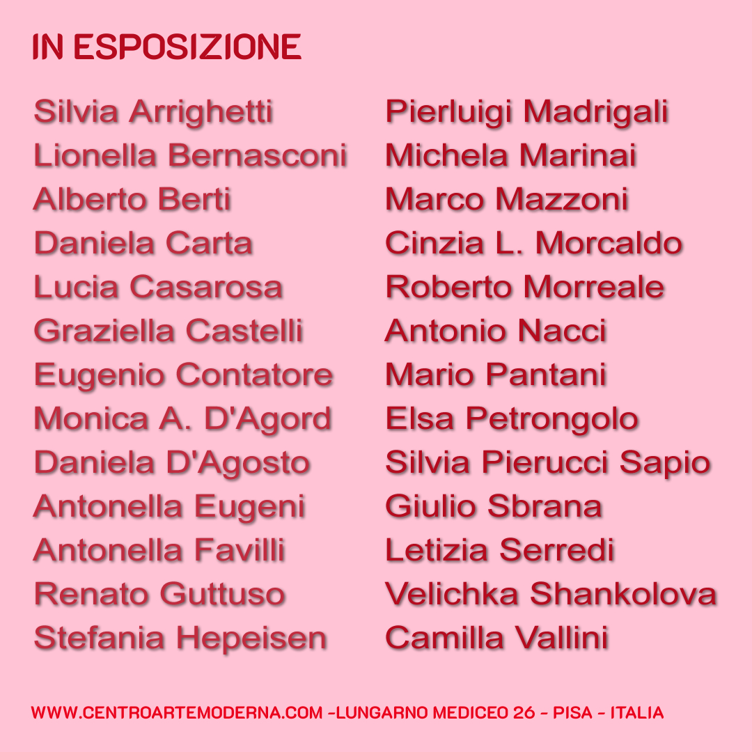 In esposizione, quindi, le opere di: Silvia Arrighetti, Lionella Bernasconi, Alberto Berti, Daniela Carta, Lucia Casarosa, Graziella Castelli, Eugenio Contatore, Monica A. D'Agord, Daniela D'Agosto, Antonella Eugeni, Antonella Favilli, Renato Guttuso, Stefania Hepeisen, Pierluigi Madrigali, Michela Marinai, Marco Mazzoni, Cinzia Lucia Morcaldo, Roberto Morreale, Antonio Nacci, Mario Pantani, Elsa Petrongolo, Silvia Pierucci Sapio, Giulio Sbrana, Letizia Serredi, Velichka Shankolova, Camilla Vallini.