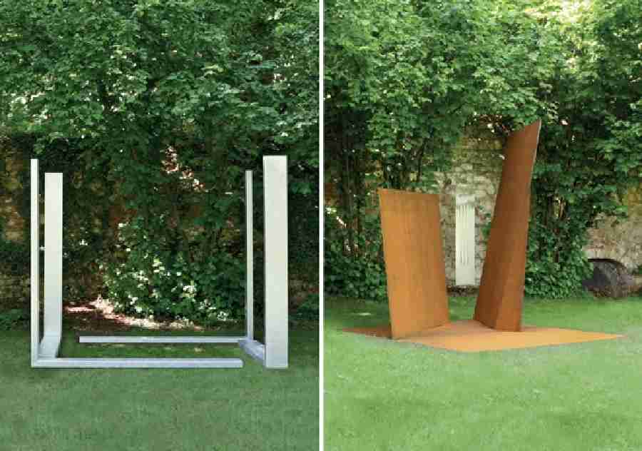 Grazia Varisco (1937, Milano) si è concentrata per questa occasione sulla relazione dell’edificio palladiano con lo spazio circostante, ideando due interventi che mettono in rapporto la Villa e il parco. Il primo si presenta come una superficie specchiante collocata a ricoprire i due corpi inclinati laterali della scalinata posteriore, che collega Villa Pisani al grande prato retrostante e all’ambiente intorno. Nel suo riflettere il cielo, adagiato come una pelle sulla struttura senza modificarne plasticamente i volumi, ma amplificandone il significato di passaggio tra interno ed esterno, questo lavoro intende connettere diversi spazi e tempi del transito del visitatore, e si dissemina anche sul prato adiacente, con alcune altre lastre specchianti più piccole, idealmente conducendolo sino alla cantina. Le dinamiche del passaggio si ritrovano nel secondo intervento, una grande scultura concepita per il parco, costituita da due lastre verticali in acciaio corten, affiancate ma non allineate tra loro, a delineare una sorta di corridoio a cielo aperto, che va restringendosi sino a culminare in una Risonanza specchiante sul fondo: nella sua impossibile percorrenza, volutamente ricreando l’effetto di una stanza che si restringe, ma in esterni e senza soffitto.