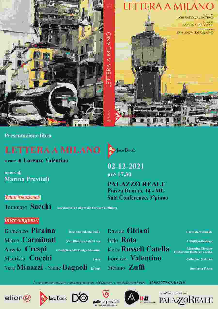 A Palazzo Reale sarà presentato il volume Lettera a Milano, a cura di Lorenzo Valentino, Jaca Book Edizioni, che contiene 52 lettere, scritte da personalità illustri, rappresentative dei diversi ambiti professionali, accompagnate dalle opere monografiche di Marina Previtali sulla realtà complessa e stratificata della metropoli lombarda. Il libro invita a una lettura ambientale di voci in ascolto che scrutano da vicino il cielo dei significati, al di là dei muri di silenzio. E' la Milano dei quartieri, delle periferie prive di una propria connotazione identitaria in contrapposizione al centro urbano disamorato della socialità.