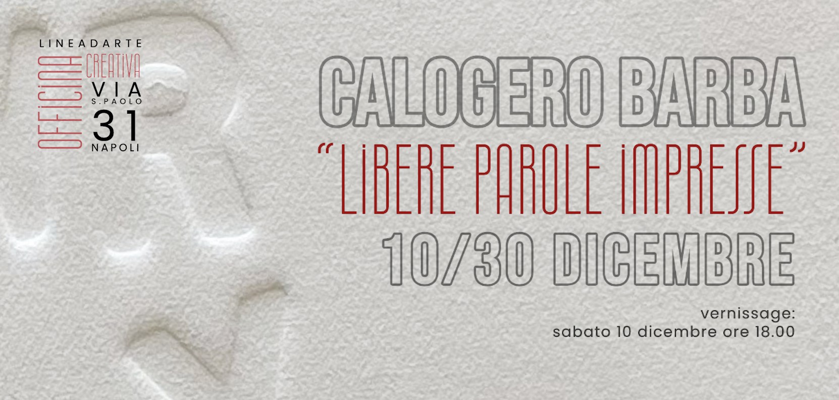 Sarà Inaugurata Sabato 10 Dicembre 2022 alle ore 18,30 presso Lineadarte Officina Creativa, isola creativa laboratorio delle libere arti, via San Paolo, 31 Napoli, la mostra personale di Calogero Barba, dal titolo “Libere Parole Impresse” a cura di Gennaro Ippolito e Giovanna Donnarumma.