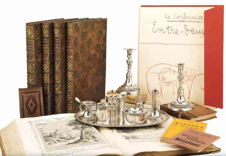 Non mancano tuttavia affascinanti rarità novecentesche come la prima edizione della Casa dei doganieri di Montale con dedica autografa del poeta (1932) valutata 3.000/3.500 euro, una prima edizione dei Canti orfici di Campana con sua dedica autografa a Papini (1914) la cui stima è di 1.000/1.500 euro, e inoltre una bella raccolta di libri futuristi e di edizioni di pregio in tiratura limitata, tra cui lo spettacolare La cravate ne vaut pas une medaille di Baj (1972) che ha una valutazione di 1.500/2.000 euro.