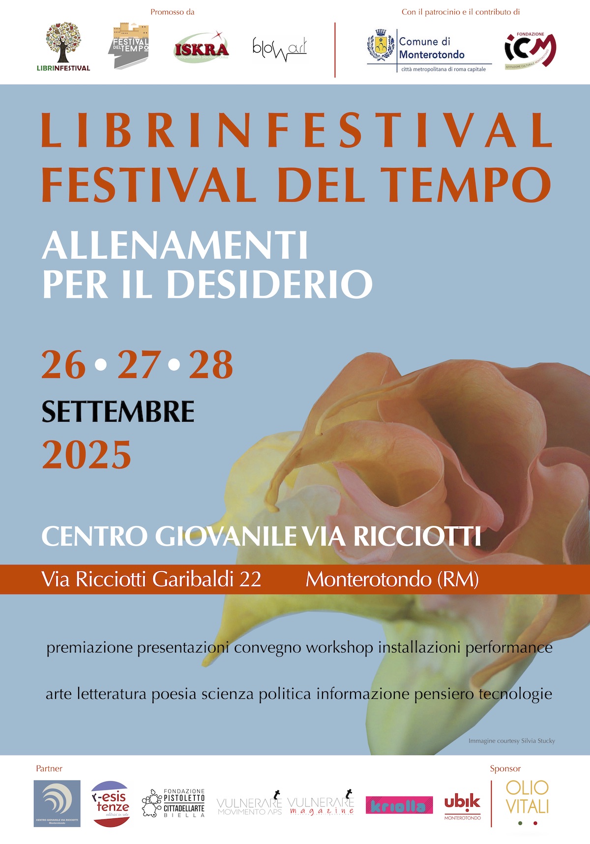 L’Edizione speciale di Librinfestival e Festival del Tempo è promossa dall’associazione culturale Librinfestival, da ISKRA Cooperativa sociale onlus e dall’associazione culturale blowart, a cura di Silvia Di Tosti, Roberta Melasecca e Alessia Fedeli, con il patrocinio e il contributo del Comune di Monterotondo e Fondazione ICM, in collaborazione con il Centro Giovanile Via Ricciotti Monterotondo, R-esistenze Editrici in rete, Movimento VulnerarTe APS, VulnerarTe Magazine, Kriolla Culture, Libreria Ubik Monterotondo, con il patrocinio di Cittadellarte Fondazione Pistoletto, con il contributo di Azienda Olio Vitali Sabina Dop.