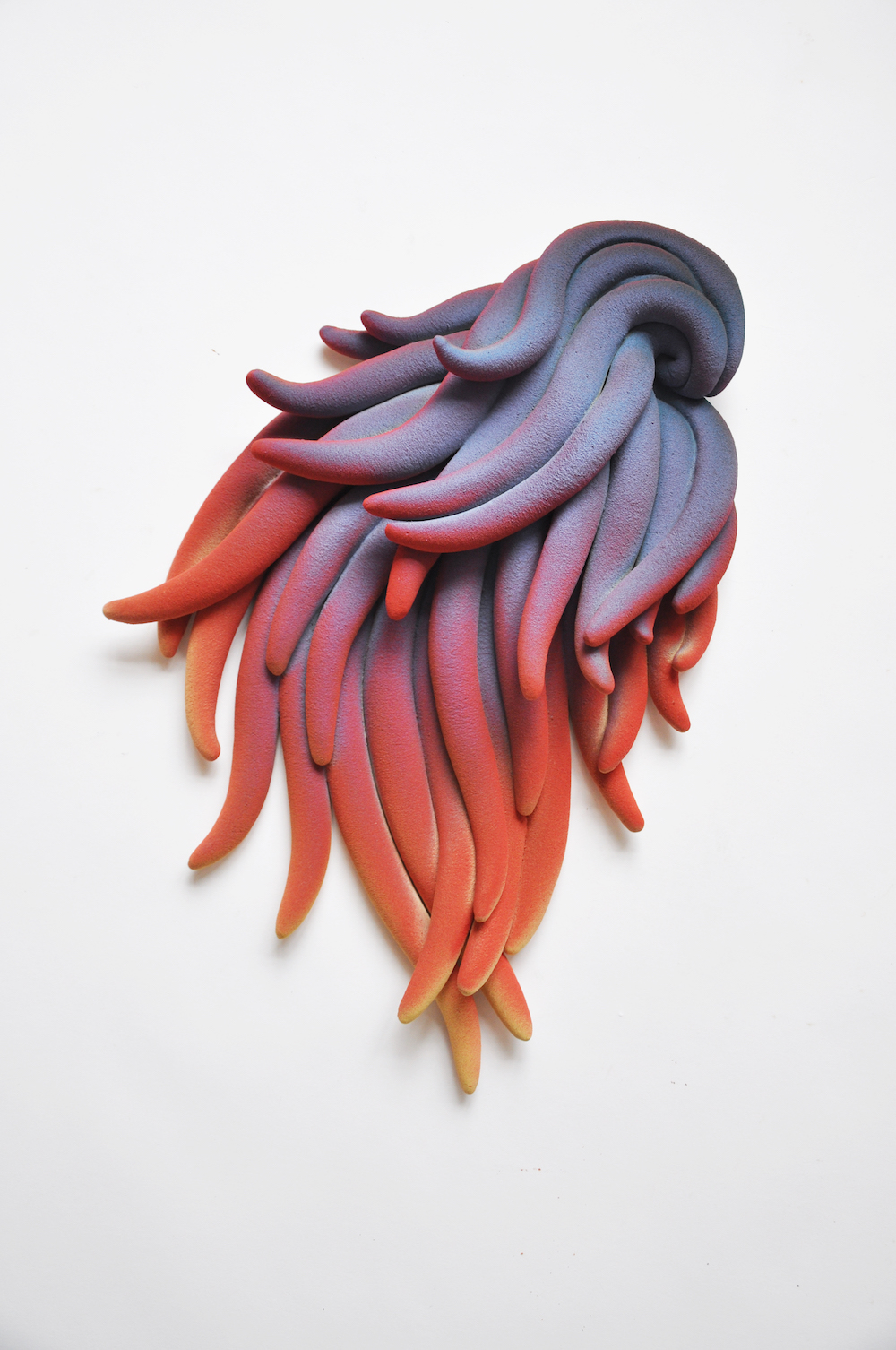 Per la mostra alla MAAB Gallery l’artista francese ha creato una serie di sculture a parete dalle forme sinuose e volanti che sembrano volersi liberare del peso della materia per librarsi nell’aria, con le loro forme serpentinate e fluide, portatrici di turbolenza e di desiderio. In queste creazioni ceramiche si scorge quindi la volontà di un artista che letteralmente tiene le mani in pasta, ma che allo stesso tempo usa la materia che plasma per liberarsi da se stessa e prendere le forme dell’aria o di una folata di vento, così come suggerire lo scorrere dell’acqua nelle rapide di un fiume. Come ha infatti dichiarato la stessa artista a proposito del proprio lavoro: “Un universo dove tutto è fuso insieme: interno ed esterno, liquido e solido, minerale e animale, vegetale e umano, come se tutto fosse fatto della stessa sostanza”.