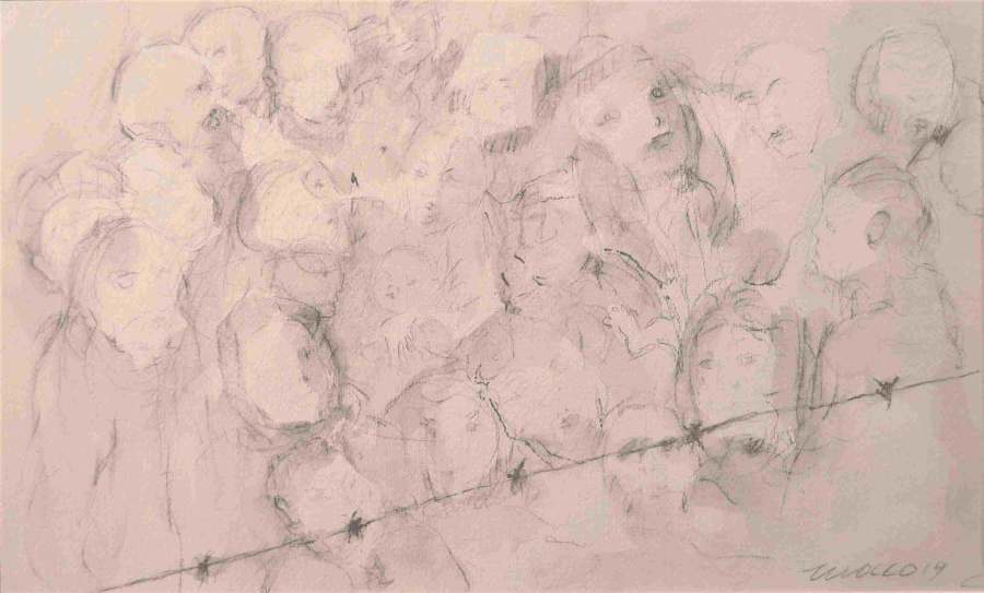 Vincenzo Ruocco, salernitano, nella sua pittura riesce a trattare la gravità di questo tema con leggerezza utilizzando tratti evanescenti e cromie calde. I volti rappresentati si confondono, diventando quasi eterei, impalpabili in contrasto con il ferro acuminato che fa da violento spartiacque tra il desiderio e la possibilità.