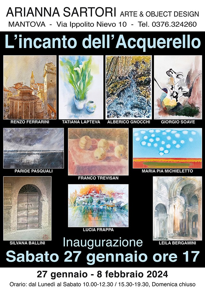 La Galleria Arianna Sartori di Mantova, nella sala di via Ippolito Nievo 10, il prossimo Sabato 27 gennaio alle ore 17.00, inaugura la mostra “L’incanto dell’Acquerello”. Alle pareti sarà possibile ammirare le opere degli artisti: Silvana Ballini, Leila Bergamini, Renzo Ferrarini, Lucia Frappa, Alberico Gnocchi, Tatiana Lapteva, Maria Pia Michieletto, Paride Pasquali, Giorgio Soave, Franco Trevisan.