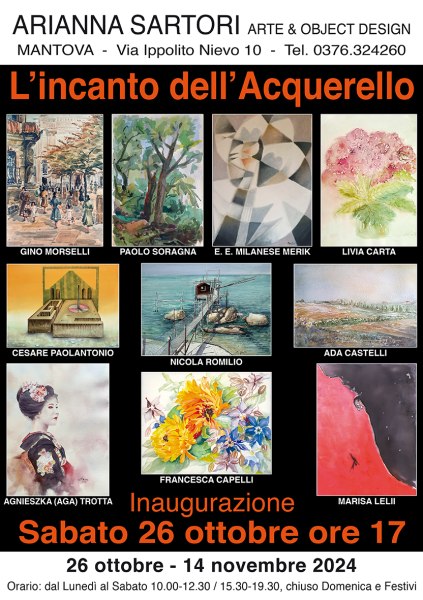 La Galleria Arianna Sartori di Mantova, nella sala di via Ippolito Nievo 10, il prossimo Sabato 26 ottobre alle ore 17.00, inaugura la mostra “L’incanto dell’Acquerello”. Alle pareti sarà possibile ammirare le opere degli artisti: Francesca Capelli, Livia Carta, Ada Castelli, Marisa Lelii, Eugenio Enrico Milanese Merik, Gino Morselli, Cesare Paolantonio, Nicola Romilio, Paolo Soragna, Agnieszka (Aga) Trotta.