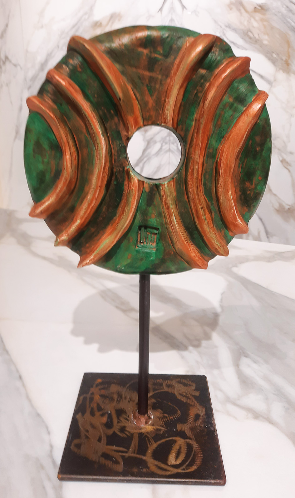 “L’artista Lino Bianco presenta per l’occasione “Dei Cerchi, dei Soli e delle Lune”, una serie di dischi dal diametro di circa 23 cm., opere in terracotta con l’uso di pigmenti, ossidi e cere. Il titolo della mostra chiarisce la lettura delle sculture che, pur aderendo al mondo dell’astrazione, palesano riferimenti al nostro immaginario spaziale. Così se in alcune le linee parallele incise suddividono i dischi e i fori centrali rettangolari ci portano alla mente l’intervento dell’uomo Faber sulla Terra, in altre il foro centrale tondo ci permette di considerare la corona circolare come imperscrutabile pur se possibile spazio siderale. In altre ancora, le pressioni sulla materia e i colori diversi di decoro ci documentano siti sconosciuti ma forieri di possibili presenze di acqua e ossigeno e quindi luoghi di futura vita”.