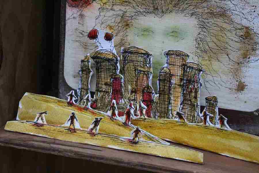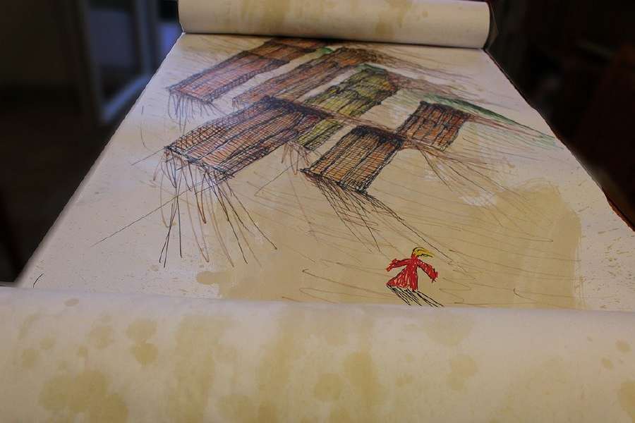 “Machina Birotularis Theatralis” è la scenografia animata della performance. Alta più di due metri, conterrà un rullo di carta illustrato che verrà srotolato durante lo spettacolo e racconterà visivamente i passaggi della storia in totale sincronia con il flusso della recitazione attoriale. Lo stile medievaleggiante, arcaico, meccanico, con un tocco futuristico, è parte dell’epica di Lunghini e di una ricerca che attraversa i segni del tempo. “La Biblioteca delle Mappe” è, invece, una vera e propria libreria, che contiene memorie di viaggi e di esploratori: micro-scenografie incastonate in tavole di legno.