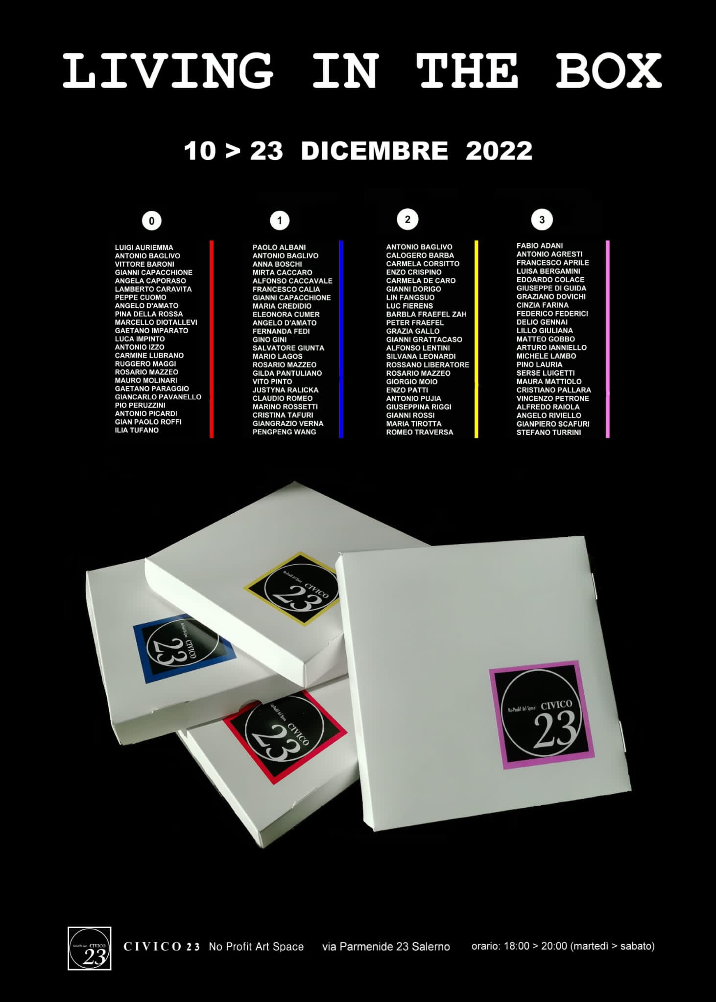 In occasione dell'uscita del terzo numero della Rivista in scatola "Civico 23" l'omonimo spazio di Salerno ha programmato una esposizione antologica in riferimento al contenuto delle altre edizioni precedenti (numero 0, 1 e 2). Questa mostra dal titolo "Living in the box" intende rendere visibile l'operato di quegli artisti, peraltro validissimi, che in questi anni hanno partecipato, su invito strettamente personale, al progetto della Rivista. L'esposizione che si terrà a partire da sabato 10 dicembre 2022 è un tributo verso tutti coloro, artisti, collezionisti e istituzioni, sia pubbliche che private, che hanno creduto in questo progetto. Quest'ultimo, nato dalla necessità di rendere trasmissibile l'opera "originale" rendendola tangibile al di là di ogni possibile ricezione digitale, ha subito riscontrato interesse tra gli addetti ai lavori, spingendo la galleria a proseguire il lavoro di ricerca e consolidamento di un prodotto ancora oggi in via di perfezionamento. In particolare nella rivista n.3 sono presenti artisti che con il loro contributo hanno reso questa edizione particolarmente ricca di opere eterogenee, interessanti perché ciascuna a suo modo espressione della contemporaneità.