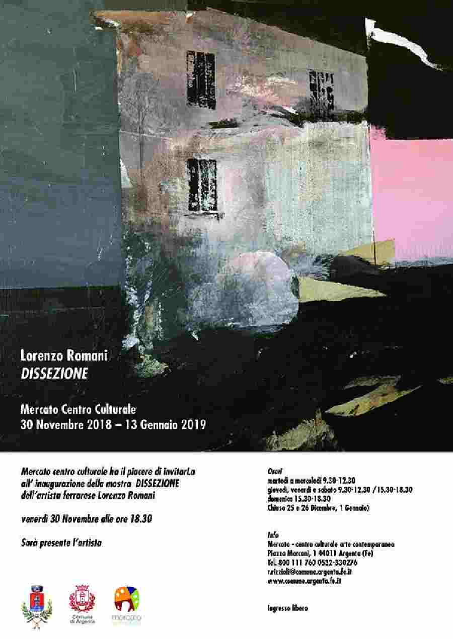 Il Centro Culturale Mercato di Argenta ospiterà al piano terra dal 30 novembre 2018 al 13 gennaio 2019, la mostra “Lorenzo Romani. Dissezione” con presentazione di Paolo Volta: in parete le opere del giovane artista ferrarese che ha saputo coniugare tradizione e ricerca personale, un originale connubio che sta conquistando pubblico e critica.