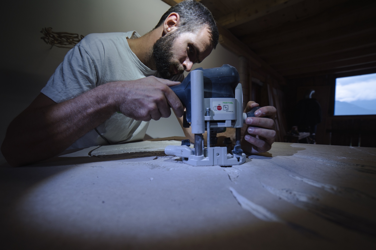 Il percorso espositivo comprende una ventina di opere scultoree, in legno, gesso e cartongesso, realizzate dal 2016 al 2023, tra le quali figurano numerosi inediti. Tre le serie principali che documentano la ricerca dell’artista: Un punto fra due cieli, Icaro fa le funzioni e Variazioni. Se le sculture lignee di pochi grammi del ciclo Un punto fra due cieli ci invitano a riflettere sull’energia vitale e generativa dell’universo, il cartongesso inciso di Icaro fa le funzioni ci pone davanti alle soglie della nostra percezione, facendoci capire che solo se distogliamo lo sguardo dall’oggetto in sé e lasciamo che la nostra attenzione cada sull’immateriale, allora siamo in grado di sentire la presenza di ciò che non possiamo vedere. La nuova serie, Variazioni, si sviluppa infine a partire dai disegni provenienti da Un punto fra due cieli che, nel cartongesso inciso, vengono ingigantiti, distorti e lavorati.