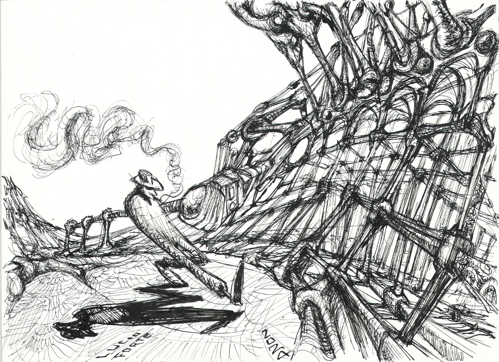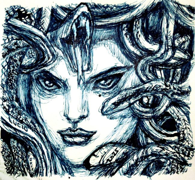 Sono in esposizione alcune opere recenti realizzate a china a pennino su carta Fabriano: Medusa 2, Untitled 67, 68, 70.