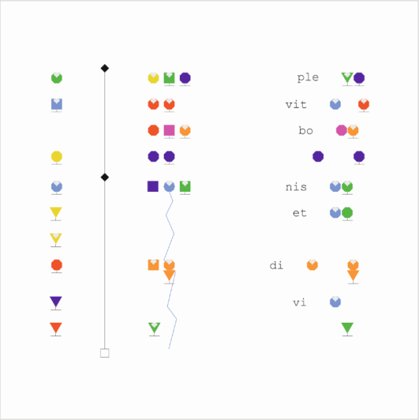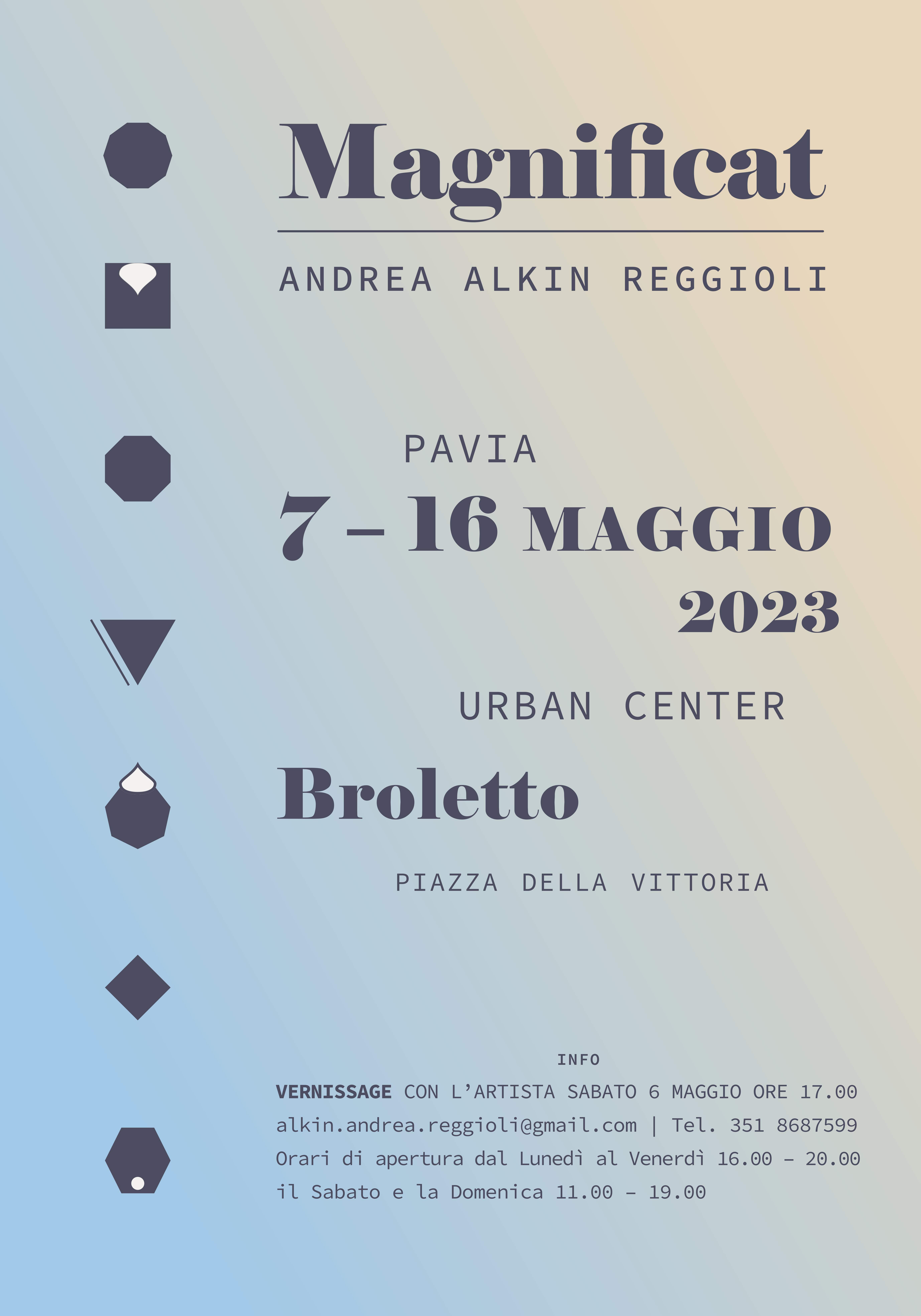 La personale di Andrea Alkin Reggioli rende omaggio alla città di Pavia e al suo insigne compositore Franco Vittadini – cui è dedicato il Conservatorio della città – con l’esposizione di alcune opere nate dalla trasposizione grafica dello spartito musicale “MAGNIFICAT”. Il percorso creativo parte dallo spartito musicale tradizionale, con l’intento di renderne più agevole la fruizione con l’utilizzo di forme geometriche di differente tipologia e colore, a rappresentare il tipo, la durata e lo stato di alterazione di ogni nota; le medesime forme, ma di colore grigio, individuano le pause; inoltre, l’impostazione verticale del rigo musicale facilita la visualizzazione delle note che devono essere suonate.