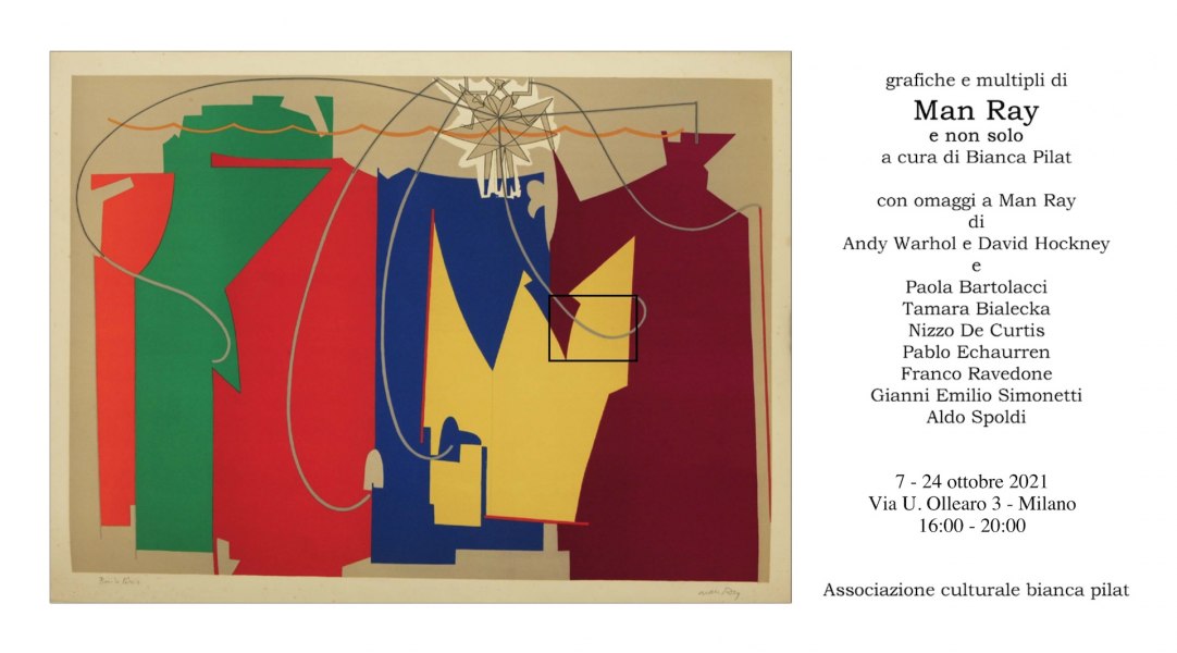 Milano 30 settembre 2021 – Giovedì 7 ottobre l'Associazione Culturale Bianca Pilat inaugura la mostra Man Ray e non solo in omaggio al grande artista statunitense. Amico e complice di Marcel Duchamp, prima con Dada e poi con il Surrealismo, Man Ray, pseudonimo di Emmanuel Rudnitzky (Philadelphia 1890 - Parigi1976), è stato protagonista e cronista ufficiale dell’arte e della fotografia di avanguardia del primo Novecento. Curata da Bianca Pilat (autrice nel 1985 del catalogo ragionato), la mostra intende puntare l’attenzione sull’interesse dell’artista per il mondo della pittura, sebbene conosciuto al grande pubblico soprattutto per le sue fotografie geniali e audaci, dedicate in gran parte al mondo femminile.